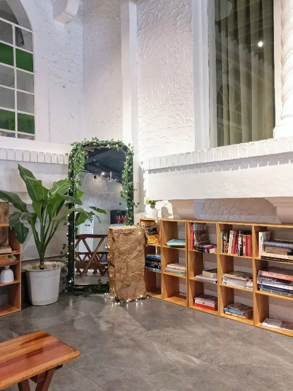 벽면을 가득 채운 책장과 곳곳에 놓인 화분들은 공간에 생기를 불어넣고, 편안한 분위기를 더한다. 특히, 커다란 거울은 공간을 더욱 넓어 보이게 하는 효과를 주면서, 동시에 포토존 역할도 톡톡히 한다. 은은한 조명 아래, 친구들과 함께 인생샷을 남기기에도 안성맞춤이다.