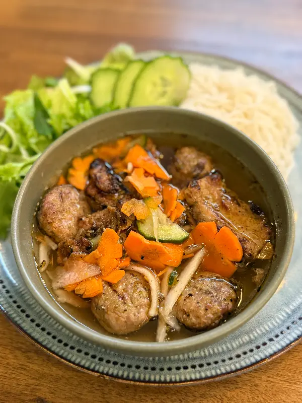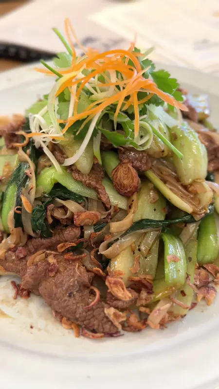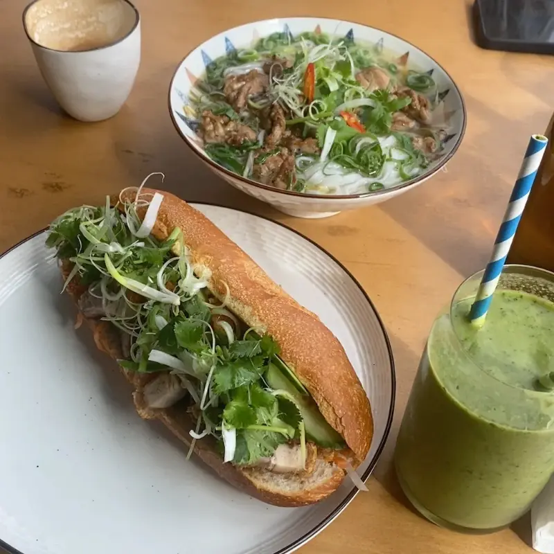 고민 끝에, 인스타그램에서 보았던 화요일 스페셜 메뉴인 바삭한 돼지고기 반미와 볶음 소고기 쌀국수를 주문했다. 잠시 후, 주문한 음식이 테이블에 놓였다. 볶음 소고기 쌀국수 위에는 채 썬 당근과 신선한 야채들이 듬뿍 올려져 있었는데, 그 색감의 조화가 마치 예술 작품을 연상시켰다.