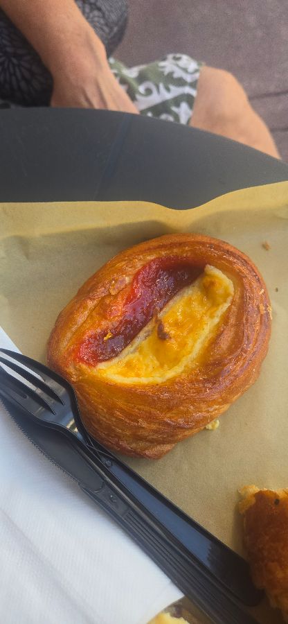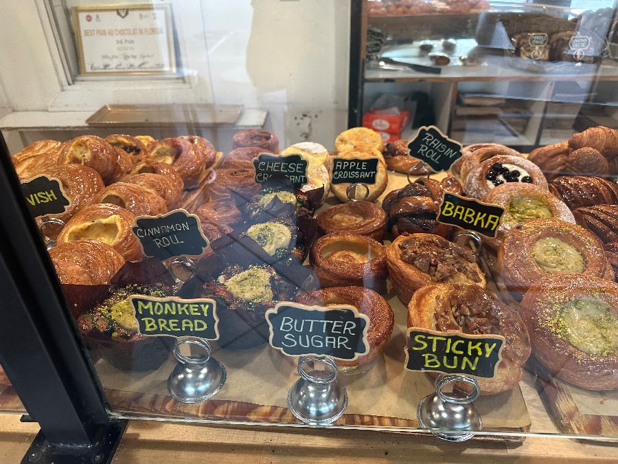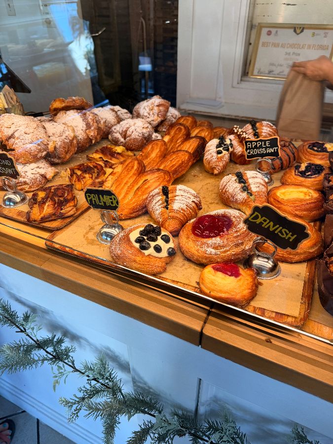 진열대를 가득 채운 빵들을 보면 저절로 행복해집니다. 쇼케이스 안에는 레몬 케이크, 다양한 크루아상, 팔미에, 피스타치오 데니쉬, 초콜릿 크루아상, 스위스 롤 등 수십 가지의 먹음직스러운 빵들이 저마다의 자태를 뽐내고 있습니다. 갓 구워낸 빵들의 은은한 윤기는 물론, 슈가파우더가 소복이 내려앉은 아몬드 크루아상, 딸기가 살짝 올라간 크루아상 등 시각적으로도 완벽한 유혹입니다. 특히 바삭한 크러스트와 촉촉하고 풍미 가득한 속살은 베탕트 베이커리의 빵 맛을 한층 더 특별하게 만듭니다. 플로리다 최고의 크루아상 타이틀은 결코 우연이 아닙니다. 이곳의 크루아상은 그야말로 예술 작품입니다. 한 입 베어 물면 바삭한 겉껍질이 부서지며 버터의 풍미가 입안 가득 퍼지고, 겹겹이 쌓인 속살은 쫄깃하면서도 부드러워 감탄을 자아냅니다. 단순한 빵을 넘어, 빵을 통해 느낄 수 있는 최고의 경험을 선사하는 곳입니다.