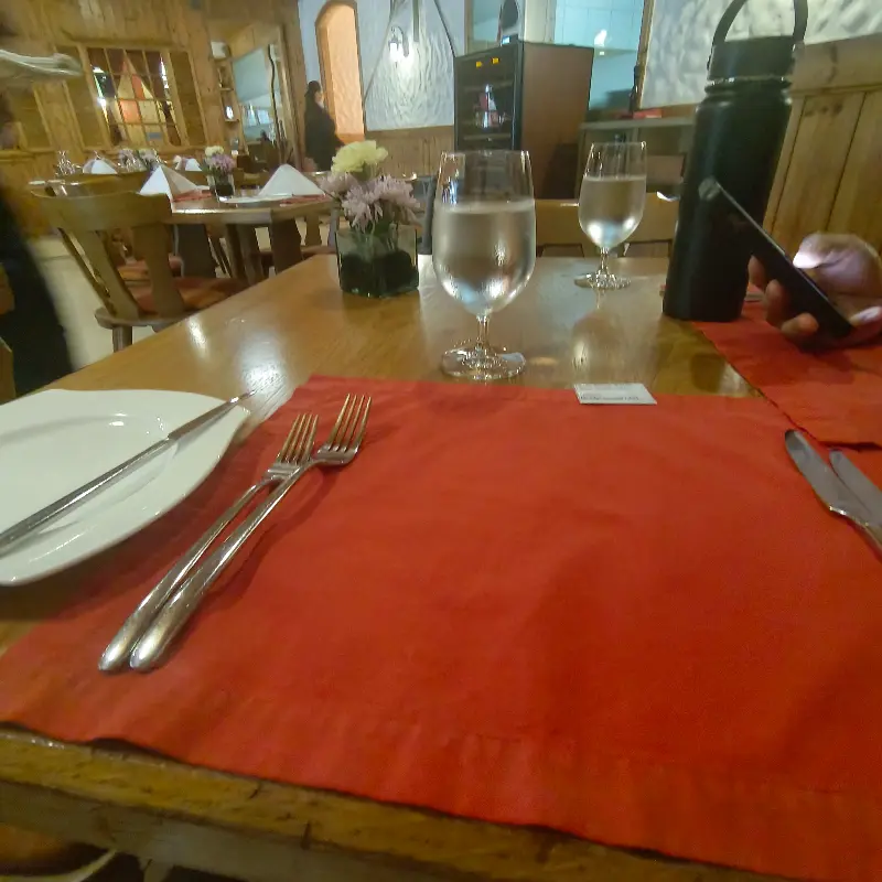 레스토랑 문을 열자 따뜻한 나무 내음이 코를 간지럽힙니다. 은은한 조명 아래 펼쳐진 테이블, 벽난로 그림이 그려진 벽면, 그리고 스위스를 연상시키는 아기자기한 소품들이 눈길을 사로잡습니다. 마치 스위스의 작은 샤텔이나 비스트로에 와 있는 듯한 포근함이 느껴집니다. 테이블 위에는 붉은색 테이블 매트가 놓여 있고, 은색 커트러리가 정갈하게 놓여 있습니다. 곧 펼쳐질 미식 경험에 대한 기대감이 더욱 커집니다.