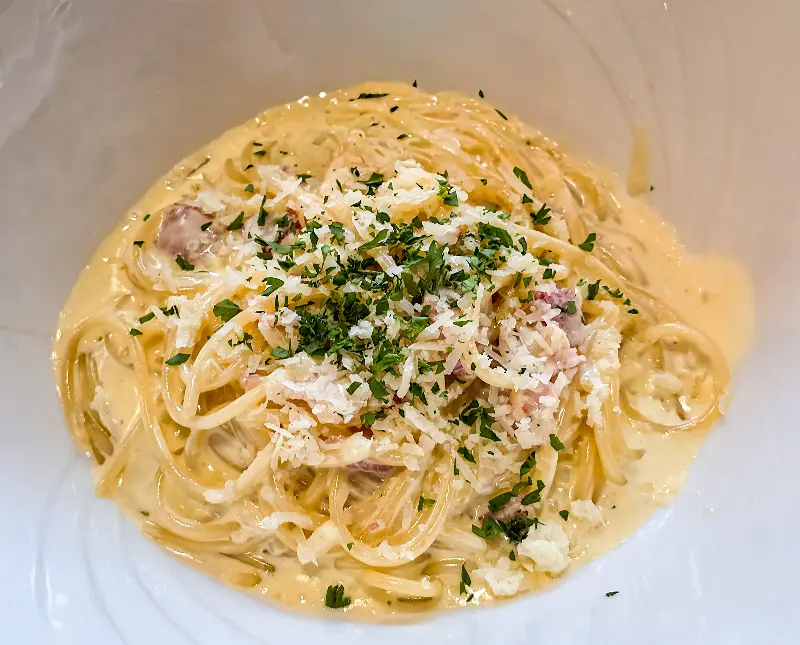 함께 주문한 카르보나라는 부드러운 크림소스와 쫄깃한 면발의 조화가 훌륭합니다. 신선한 파슬리가 듬뿍 뿌려져 있어, 느끼함 없이 깔끔한 맛을 즐길 수 있습니다.