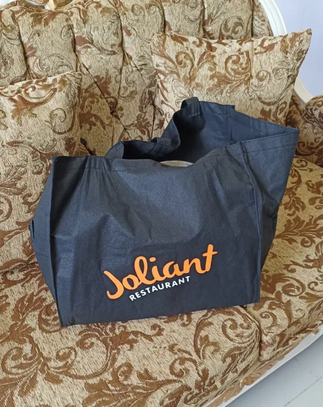 졸리언트 레스토랑은 포장 서비스도 제공합니다. 집이나 사무실에서도 졸리언트의 맛있는 음식을 즐길 수 있다는 점은 매우 매력적입니다. 특히 졸리언트 레스토랑 로고가 새겨진 검은색 포장 가방은 고급스러움을 더합니다. 다음 회사 모임에 졸리언트의 음식을 포장해 가면 분명 인기 만점일 것입니다.