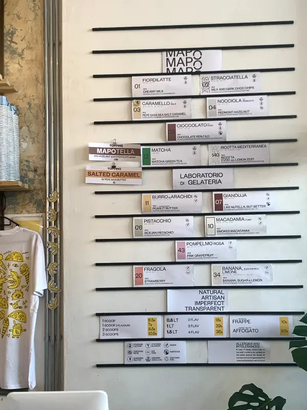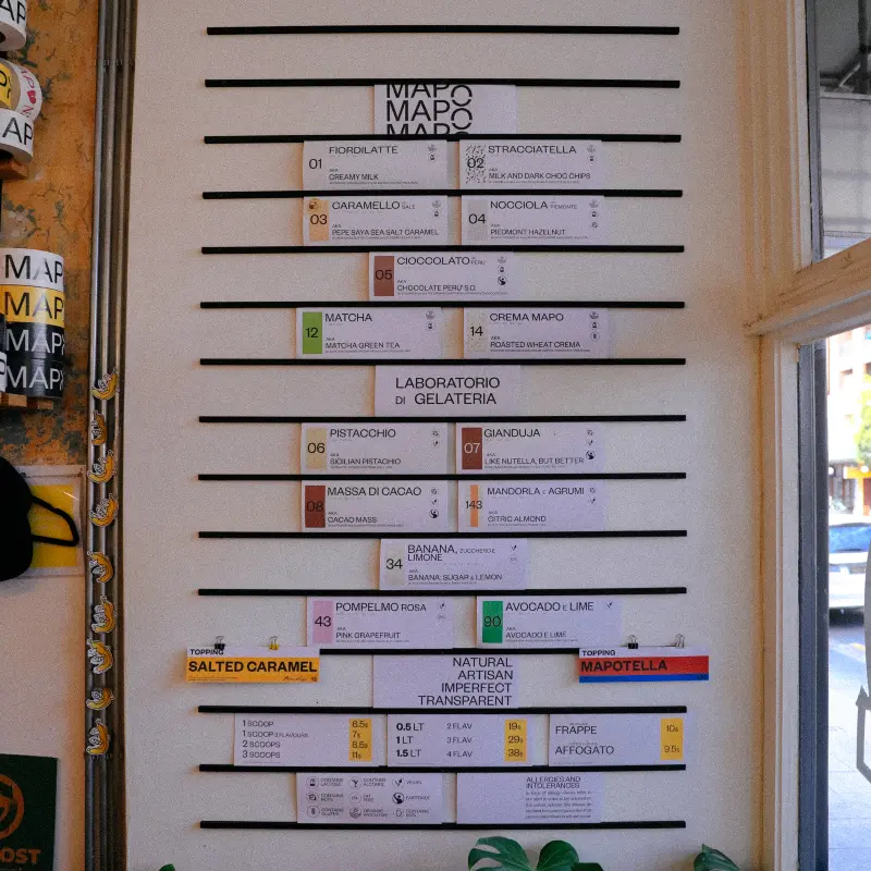 벽면에 길게 늘어선 메뉴판이 눈에 들어왔다. 마치 미술관의 작품 목록처럼, 젤라또 이름들이 세련된 폰트로 적혀 있었다. Fiordilatte, Stracciatella, Nocciola, Matcha… 처음 들어보는 이름들이 가득했지만, 왠지 모르게 설레는 기분이었다.