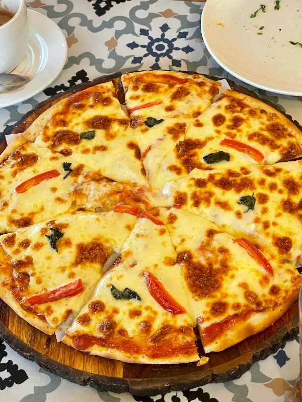피자 또한 빼놓을 수 없는 메뉴입니다. 특히 치킨 페리페리 피자는 매콤한 페리페리 소스와 부드러운 치킨의 조화가 훌륭합니다. 얇고 바삭한 도우 위에 풍성하게 올려진 토핑은 입안 가득 행복을 선사합니다. 친구들과 함께 방문하여 다양한 피자를 맛보는 것도 좋은 선택입니다. 이미지 속 피자는 8조각으로 나뉘어져 있으며, 토마토 소스를 기반으로 치즈가 듬뿍 덮여 있고, 바질과 빨간 파프리카로 포인트를 주어 시각적인 즐거움까지 더합니다.