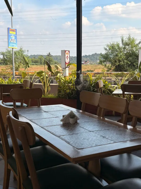 햇살이 따스하게 들어오는 야외 테이블, 여유로운 식사를 즐기기에 완벽한 공간입니다.