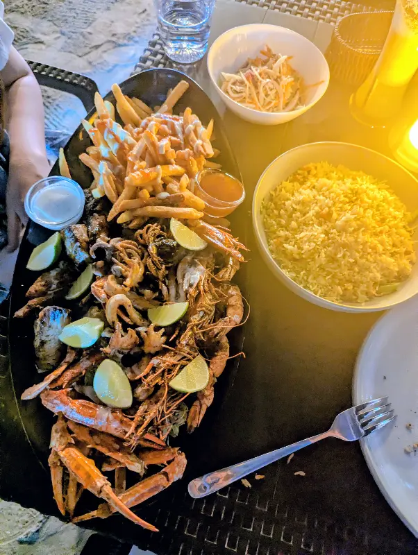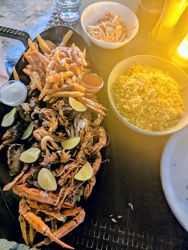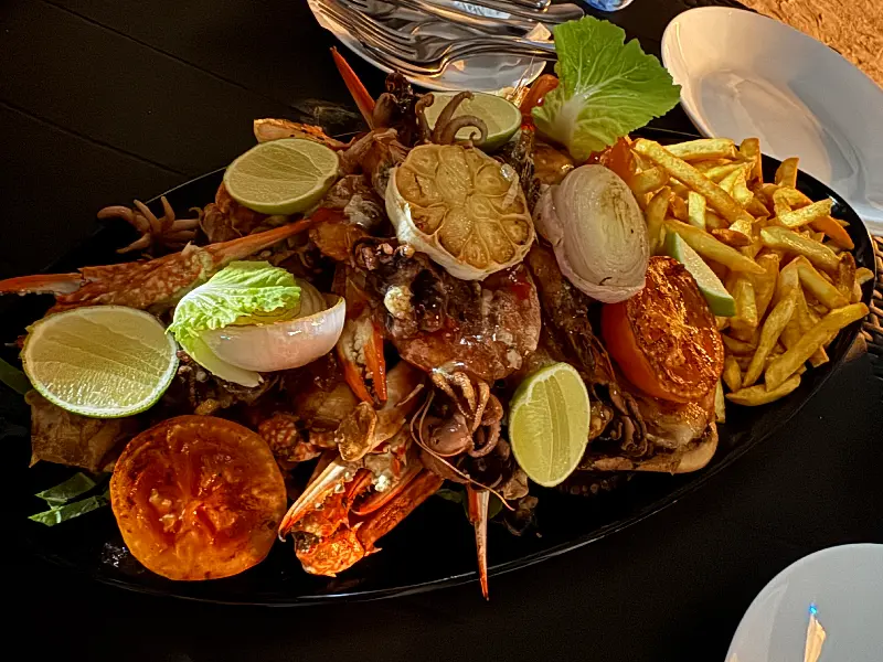 사진 속 해산물 플래터를 자세히 보면, 큼지막한 새우와 랍스터, 오징어, 그리고 볶음밥과 샐러드까지, 정말 푸짐한 구성이라는 것을 알 수 있습니다. 둘이서 먹기에도 넉넉한 양이었지만, 워낙 맛있어서 남김없이 해치웠습니다.