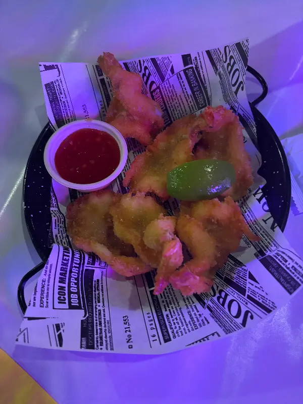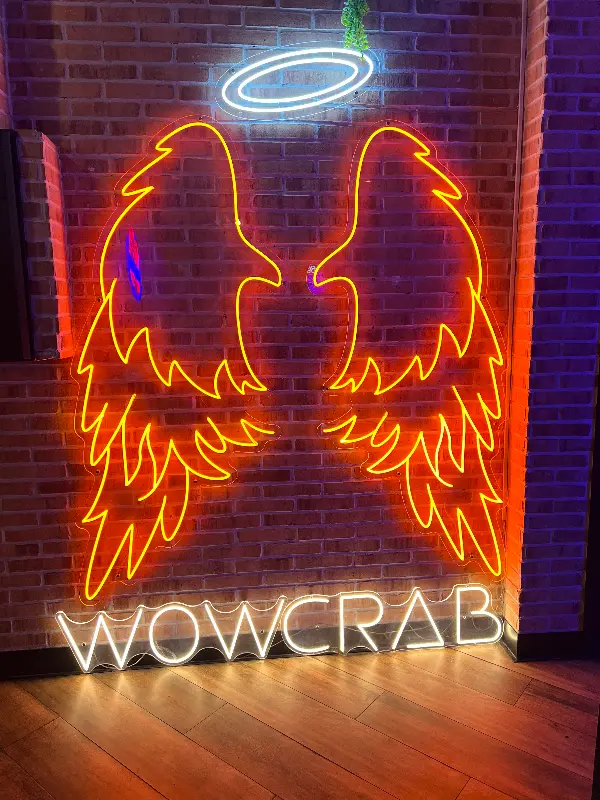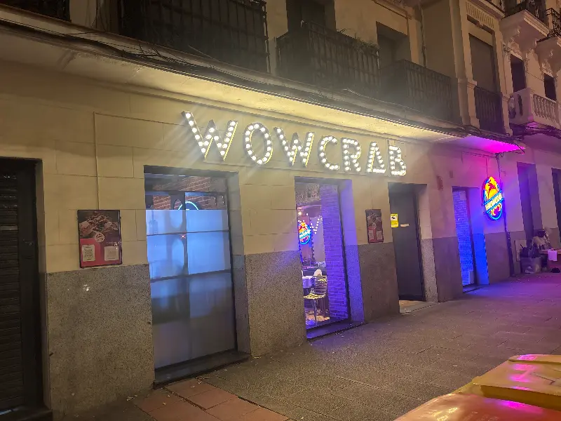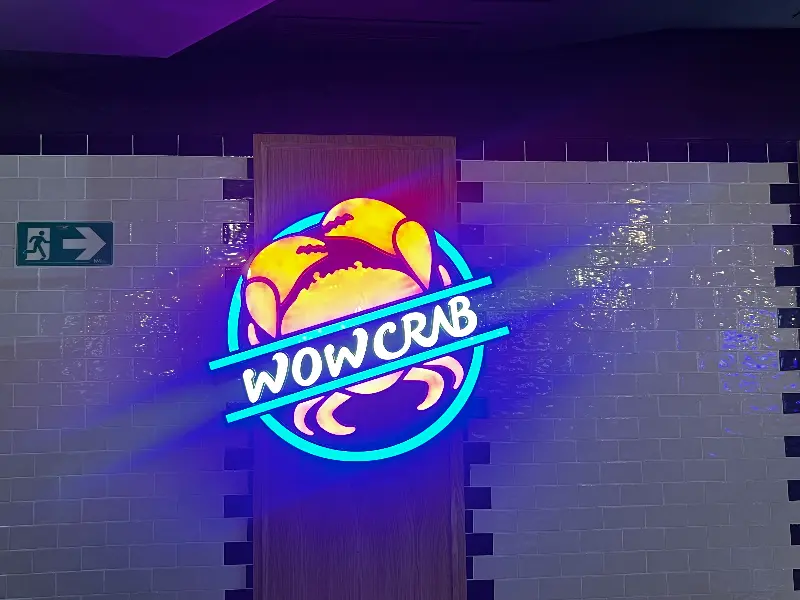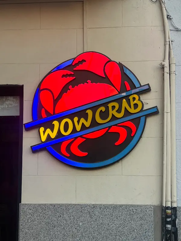 WOWCRAB에 도착했을 때 가장 먼저 눈에 띈 것은 강렬한 붉은색 게가 그려진 간판이었습니다. 네온사인으로 빛나는 ‘WOWCRAB’ 글자는 마치 맛있는 해산물 요리가 가득한 미지의 세계로 초대하는 듯했습니다. 밖에서 보이는 가게 내부는 아늑하고 활기찬 분위기로 가득 차 있었는데, 이는 맛에 대한 기대를 한층 더 높여주었습니다.