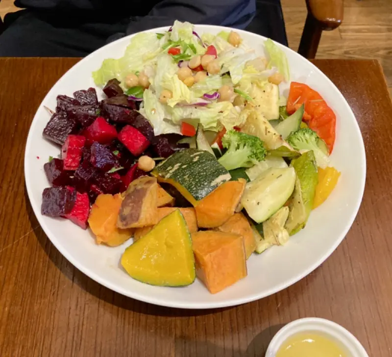 주문 후, 식당을 둘러보았다. 테이블은 넉넉하게 배치되어 있었고, 혼자 와서 식사를 즐기는 사람들도 많았다. 편안한 분위기 덕분에 혼밥도 전혀 어색하지 않았다. 잠시 후, 내가 주문한 샐러드가 나왔다. 푸짐한 양에 놀랐다. 알록달록한 색감은 보기만 해도 식욕을 자극했다.