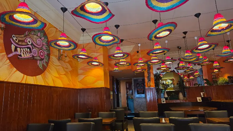 레스토랑 문을 열자마자 눈에 들어온 것은 화려한 인테리어였다. 천장에 매달린 알록달록한 솜브레로 조명이 단연 압권이었다. 멕시코 전통 모자를 활용한 독특한 디자인은 이국적인 분위기를 한껏 고조시켰다. 벽면에는 강렬한 색감의 벽화가 그려져 있어 마치 멕시코의 어느 작은 마을에 와 있는 듯한 착각을 불러일으켰다. 테이블과 의자는 짙은 나무색으로 통일되어 있어 전체적으로 따뜻하고 아늑한 느낌을 주었다. 활기 넘치는 분위기 덕분에 식사를 시작하기도 전에 이미 기분이 좋아졌다.