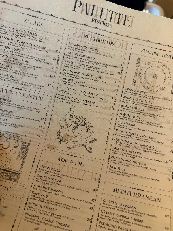 다채로운 메뉴가 가득한 팔레트 비스트로의 메뉴판. 샐러드부터 파스타, 중동 요리까지 선택의 폭이 넓습니다.