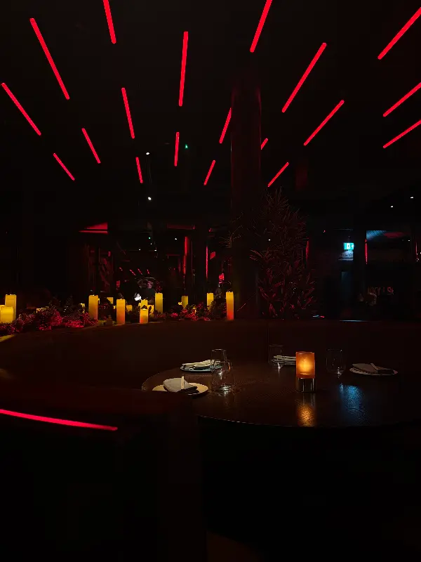 붉은 조명 아래 활기 넘치는 분위기