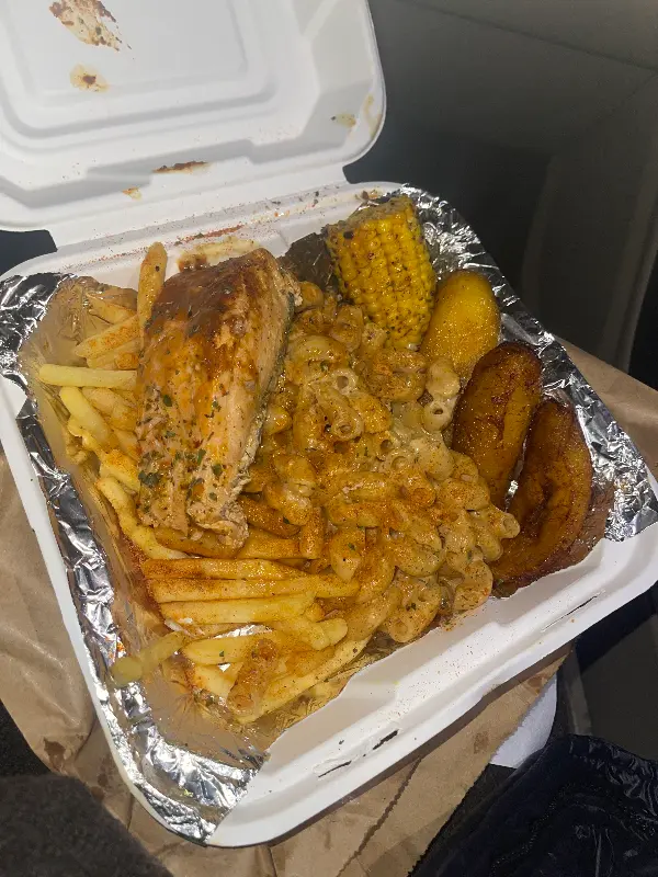 드디어 첫 입을 맛보는 순간. 닭고기는 겉은 바삭하고 속은 촉촉했습니다. 짭짤하면서도 은은한 향신료 향이 입안 가득 퍼져 나갔습니다. 맥앤치즈는 부드럽고 고소했습니다. 느끼하지 않고 담백해서 계속 먹게 되는 맛이었습니다. 옥수수는 톡톡 터지는 식감이 재미있었고, 플랜틴은 달콤하면서도 쫀득했습니다. 각각의 재료들이 개성 넘치는 맛을 자랑하면서도 전체적으로 조화로운 맛을 냈습니다.