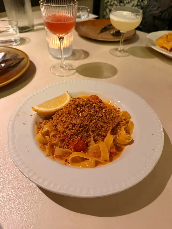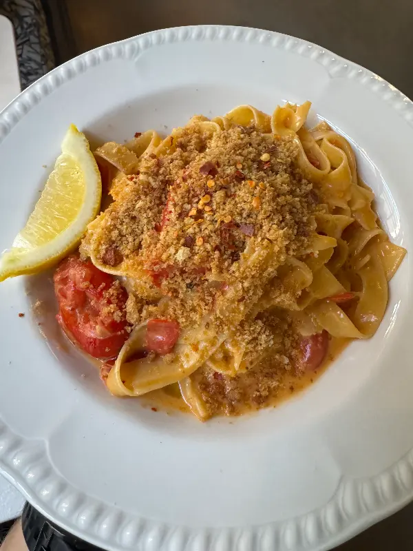접시 가득 담긴 파스타 위에 뿌려진 빵가루와 신선한 토마토, 그리고 상큼함을 더하는 레몬 한 조각이 식욕을 자극합니다.