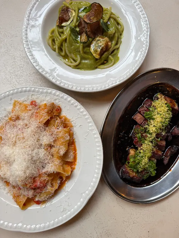 테이블 위에 놓인 파스타와 칵테일. 맛있는 음식과 함께 분위기를 즐기기에 완벽한 조합입니다.