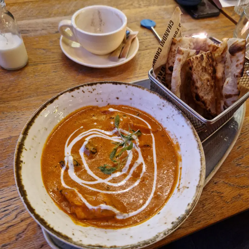 부드러운 크림이 올라간 버터 치킨과 바삭한 갈릭 난의 환상적인 조합