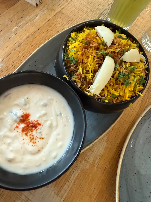 라이타와 함께 제공되는 양고기 비리야니의 모습
