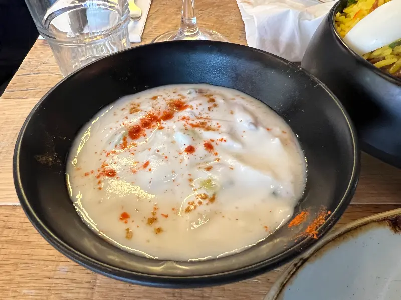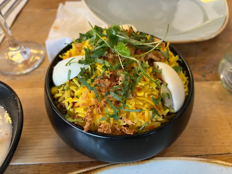 다음은 내가 주문한 양고기 비리야니. 밥알 하나하나에 향신료의 향이 은은하게 배어 있었고, 큼지막한 양고기가 듬뿍 들어 있었다. 포크로 양고기를 살짝 찍어 입에 넣으니, 부드러운 식감과 함께 깊은 풍미가 느껴졌다. 밥과 양고기를 함께 먹으니, 그 맛은 더욱 환상적이었다. 특히, 함께 제공된 라이타(Raita, 요거트 소스)를 곁들여 먹으니, 매콤한 비리야니의 맛을 부드럽게 잡아주어 더욱 맛있게 즐길 수 있었다. 밥알은 고슬고슬하면서도 찰기가 있었고, 양고기는 잡내 없이 깔끔했다.