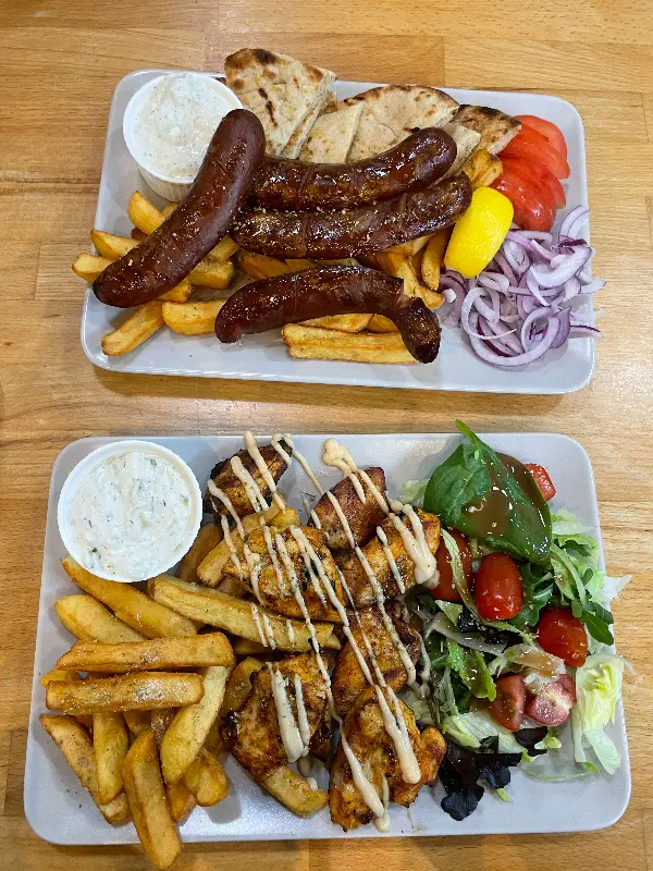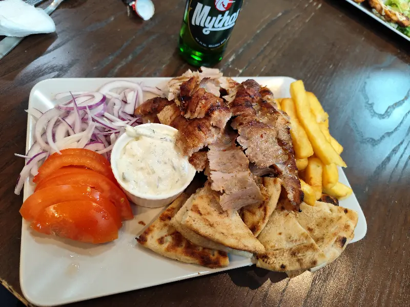 결정하기 어려울 땐, 역시 추천 메뉴가 최고죠. 직원분의 친절한 설명과 추천을 받아 자이로와 수블라키를 주문했습니다. 특히, 이곳의 자이로는 이 동네 최고라는 칭찬이 자자하다고 하니 기대감이 더욱 커졌습니다. 잠시 후, 테이블 위에 놓인 음식들은 보기만 해도 군침이 돌았습니다. 신선한 재료와 정성스러운 손길이 느껴지는 비주얼은, 맛에 대한 기대감을 한껏 끌어올렸습니다.