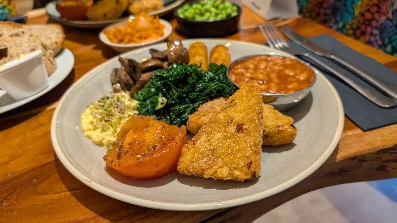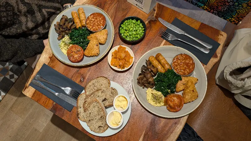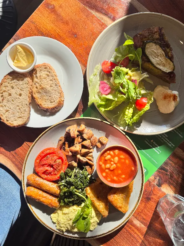 주문 후 얼마 지나지 않아, 잉글리시 브렉퍼스트가 테이블 위에 놓였다. 사진으로만 보던 비건 잉글리시 브렉퍼스트의 모습은 정말 먹음직스러웠다. 토스트, 소시지, 버섯, 토마토, 콩 등 다양한 재료들이 한 접시에 담겨 있었고, 알록달록한 색감이 식욕을 자극했다.
