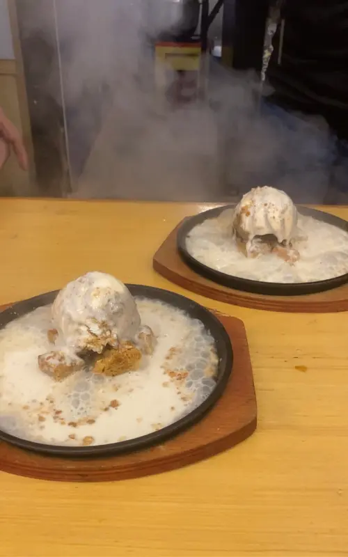 식사의 마지막을 장식할 디저트는 ‘지글지글 아이스크림’이었다. 뜨거운 철판 위에서 지글거리는 아이스크림은 시각적으로도 매우 흥미로웠다. 차가운 아이스크림과 뜨거운 철판의 조화는 그 자체로 하나의 예술 작품과 같았다.