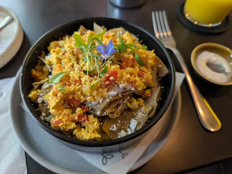 기다리고 기다리던 칠라킬레스 콘 토푸 아 라 멕시카나가 드디어 나왔다. 겉은 바삭하고 속은 촉촉한 토르티야 칩 위에 매콤한 살사 소스와 부드러운 두부가 듬뿍 올려져 있다. 형형색색의 신선한 야채와 향긋한 허브가 더해져 보기만 해도 군침이 돈다.