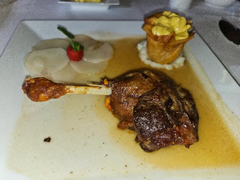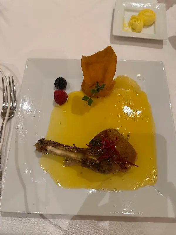 사진 속 메인 요리는 그 섬세함이 그대로 드러납니다. 윤기가 흐르는 갈색 소스는 깊은 풍미를 예감하게 하고, 그 위에 살포시 얹어진 노란색 소스는 시각적인 즐거움을 더합니다. 곁들여진 채소와 장식은 요리의 완성도를 높이며, 쉐프의 세심한 손길을 엿볼 수 있습니다. 이러한 정성은 맛뿐만 아니라 시각적인 만족감까지 선사하며, Les Moustaches에서의 식사를 더욱 특별하게 만들어줍니다.