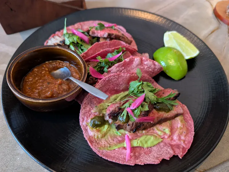 바삭한 칩을 과카몰리에 듬뿍 찍어 입에 넣는 순간, 신선한 아보카도의 풍미와 라임의 상큼함이 입안 가득 퍼져 나갔다. 짭짤하면서도 고소한 맛은 칵테일과 완벽한 조화를 이루며, 입맛을 돋우는 역할을 톡톡히 했다. 립아이 타코는 부드러운 육질과 신선한 야채의 조화가 훌륭했고, 매콤한 소스는 느끼함을 잡아주어 질리지 않고 계속 먹을 수 있었다.