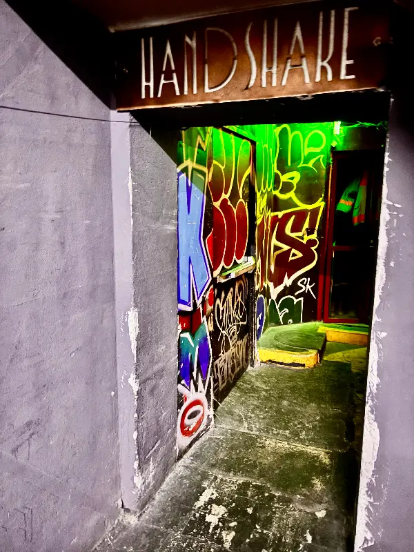 어둑한 복도를 지나, 화려한 그래피티 아트로 장식된 벽을 따라 안으로 들어가면, 비로소 Handshake의 비밀스러운 공간이 눈 앞에 펼쳐집니다. 입장하는 순간, 90분이라는 제한 시간이 주어지지만, 그 시간 동안 온전히 칵테일과 분위기를 즐기기에 충분합니다.