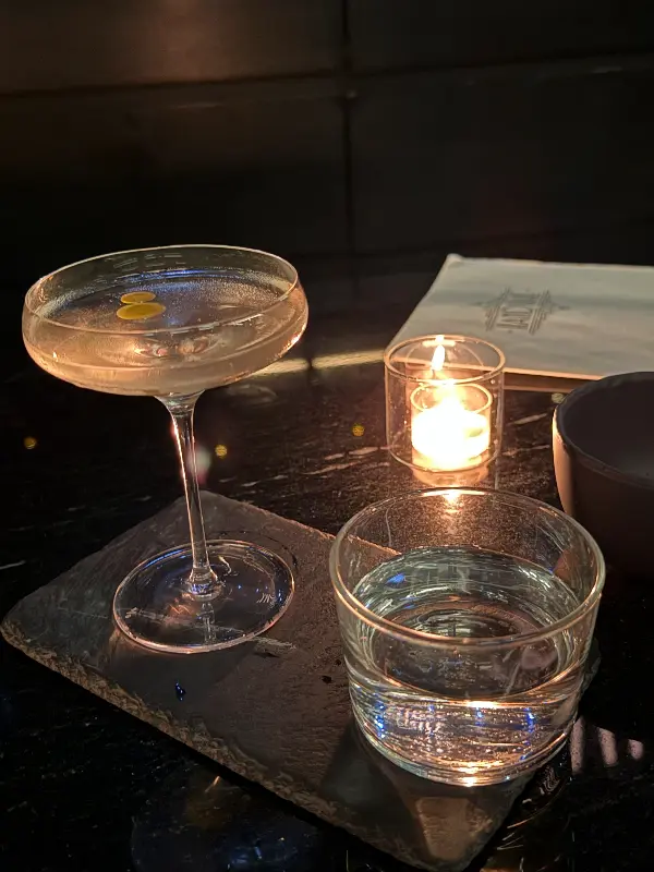 섬세한 장식이 돋보이는 칵테일. 칵테일 글라스와 곁들여진 물잔, 촛불의 조화가 고급스러운 분위기를 더합니다.
