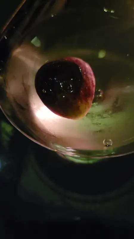 은은한 조명 아래 빛나는 칵테일 글라스. 몽환적인 분위기를 자아냅니다.