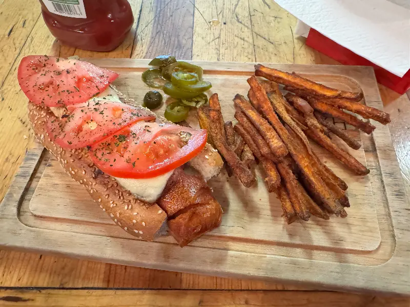 드디어 기다리고 기다리던 핫도그가 나왔다. 나무 도마 위에 올려진 핫도그의 압도적인 비주얼에 감탄사가 절로 나왔다. 빵은 겉은 바삭하고 속은 촉촉했고, 소시지는 육즙이 가득했다. 특히, 칠랑고 핫도그는 매콤하면서도 달콤한 칠리 소스와 신선한 야채들이 환상적인 조화를 이루었다. 한 입 베어 무는 순간, 입안 가득 퍼지는 풍미에 눈이 번쩍 뜨였다.