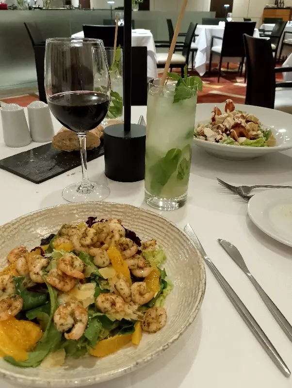 샐러드는 신선한 해산물과 상큼한 오렌지가 조화를 이루어 입맛을 돋우는 역할을 했습니다. 드레싱 또한 과하지 않고 재료 본연의 맛을 살려주어 좋았습니다. 와인 한 잔과 함께 샐러드를 즐기니, 마치 지중해 어느 해변가에 와 있는 듯한 기분이 들었습니다.
