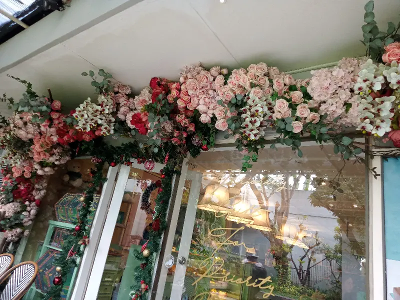 Exquise Patisserie는 규모는 작지만, 그 안에 담긴 분위기는 이루 말할 수 없이 매력적이다. 섬세하게 꾸며진 꽃 장식은 공간에 생기를 불어넣고, 곳곳에 놓인 아기자기한 소품들은 마치 비밀 정원에 들어온 듯한 느낌을 선사한다. 한쪽 벽면을 가득 채운 케이크 쇼케이스는 그 자체로 하나의 예술 작품처럼 보인다. 형형색색의 케이크들이 마치 보석처럼 빛나고 있어, 어떤 것을 골라야 할지 한참을 망설였다.