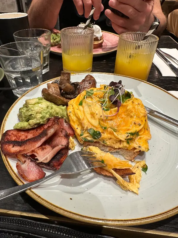 드디어 기다리고 기다리던 음식이 나왔습니다. 저는 스크램블 에그, 바삭한 베이컨, 양념이 잘 된 으깬 아보카도, 그리고 버섯이 함께 나오는 아침 식사 메뉴를 주문했습니다.