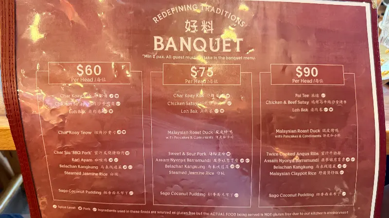 호랴오(Ho Liao)에서는 혼자 또는 둘이서 간단하게 즐길 수 있는 단품 메뉴뿐만 아니라, 가족이나 단체 손님을 위한 연회 메뉴도 제공합니다. 연회 메뉴는 다양한 말레이시아 요리를 한 번에 맛볼 수 있도록 구성되어 있으며, 푸짐한 양 덕분에 배부르게 식사를 즐길 수 있습니다. 마치 말레이시아 가정식 요리를 먹는 듯한 따뜻하고 푸근한 느낌을 받을 수 있습니다.