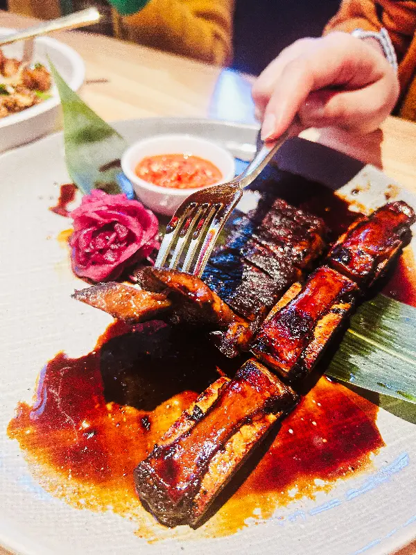 자리에 앉아 메뉴를 펼쳐보니, 평소에 접하기 어려웠던 다양한 말레이시아 요리들이 눈에 띄었습니다. 고민 끝에 몇 가지 메뉴를 골라 주문했고, 곧이어 테이블 위는 풍성한 음식들로 가득 채워졌습니다. 가장 먼저 맛본 음식은 꿀을 바른 앵거스 갈비였습니다. 윤기가 흐르는 겉모습부터 시선을 사로잡았는데, 한 입 베어 무는 순간 입안에서 살살 녹는 듯한 부드러운 식감에 감탄했습니다. 달콤한 꿀과 고소한 갈비의 조화는 정말 환상적이었습니다. 젓가락으로 살짝 건드려도 부드럽게 분리되는 갈비는, 숙련된 솜씨로 오랜 시간 정성스럽게 조리되었음을 짐작하게 했습니다.