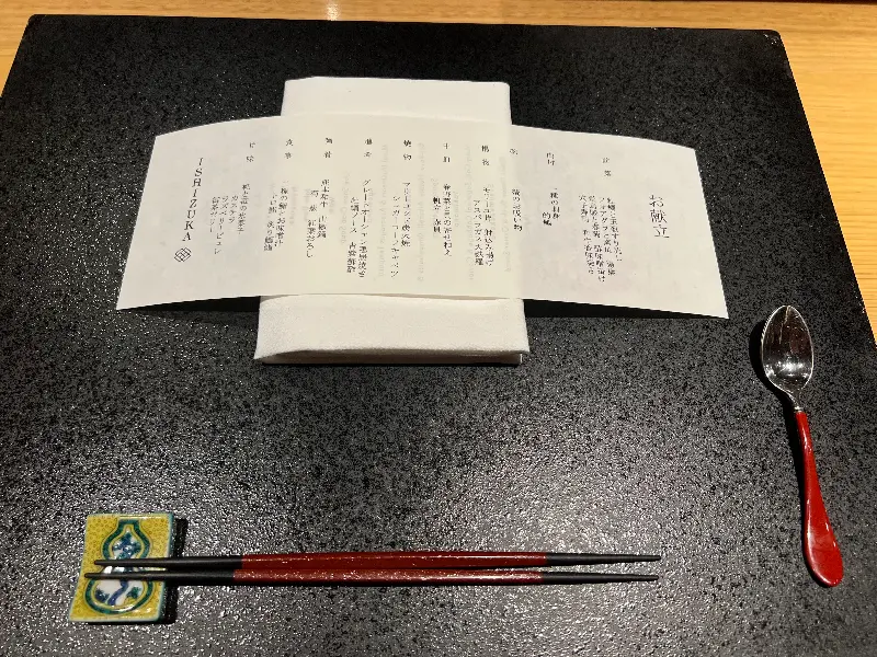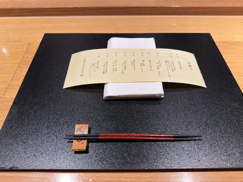 테이블 세팅의 정갈함이 돋보입니다. 검은색 테이블 매트 위에 놓인 메뉴와 젓가락 받침이 인상적입니다.