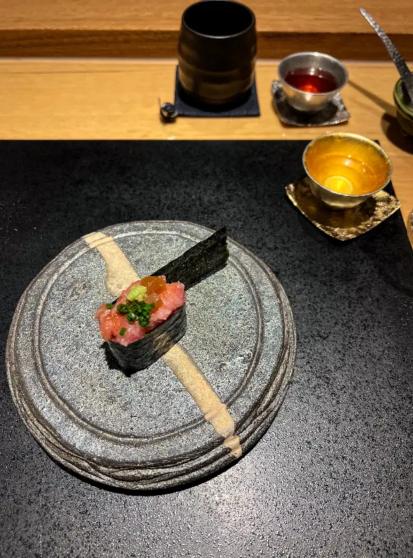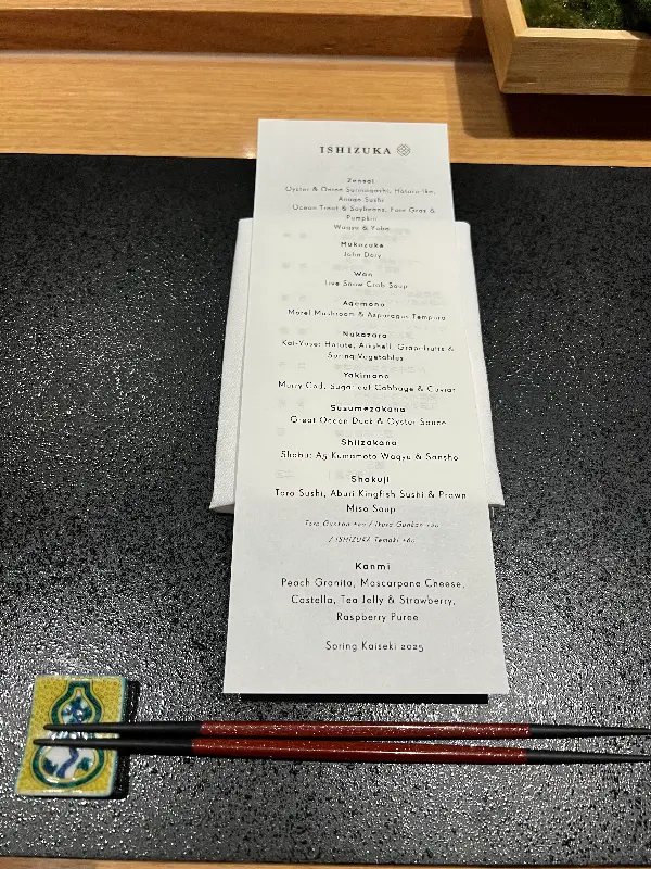 이시즈카의 오마카세 코스는 그야말로 예술 작품이었습니다. 킹피시 초밥은 김과 밥의 풍미가 완벽하게 조화를 이루어 입안 가득 행복을 선사했습니다.