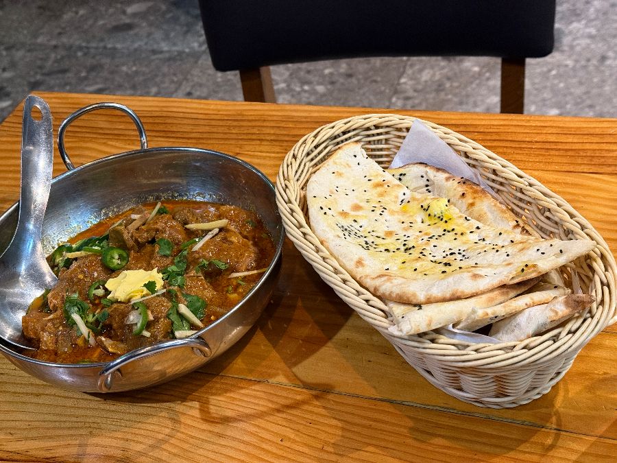 잠시 후, 테이블 위로 푸짐한 요리들이 하나둘씩 놓이기 시작했습니다. 짙은 갈색 소스가 인상적인 양고기 카라이는 부드러운 양고기와 매콤한 향신료의 조화가 일품이었고, 노릇하게 구워진 치킨 케밥은 겉은 바삭하고 속은 촉촉한 완벽한 맛을 자랑했습니다. 특히 카라이 위에 뿌려진 신선한 고수 잎은 향긋함을 더하며 풍미를 한층 끌어올렸습니다.