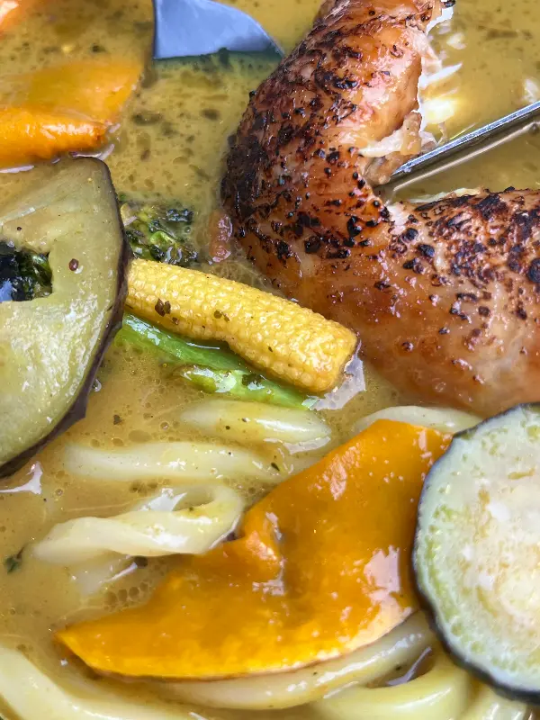 코코넛 카레는 향긋한 코코넛 향과 은은한 매콤함이 어우러져 독특한 풍미를 자아냈습니다. 특히, 카레 속에 들어간 야채들은 하나하나 정성스럽게 구워져, 재료 본연의 맛을 더욱 풍부하게 느낄 수 있었습니다. 큼지막한 닭다리 구이는 겉은 바삭하고 속은 촉촉하여, 카레와 환상적인 조화를 이루었습니다. 한 입 베어 물 때마다 입안 가득 퍼지는 풍미는, 마치 미식 여행을 떠나온 듯한 기분을 선사했습니다. 이미지 3을 보면, 카레 속 닭다리의 노릇하게 구워진 모습과 신선한 야채들의 색감이 식욕을 자극합니다.