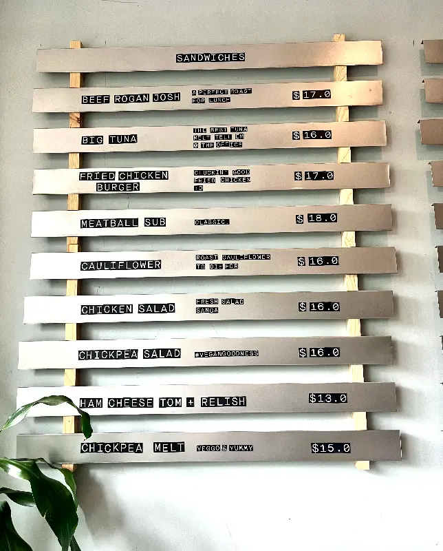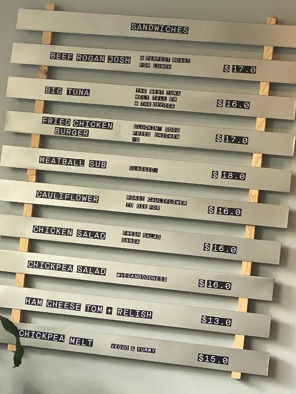 카페에 들어서자 아늑한 분위기가 물씬 풍겼다. 공간은 그리 넓지 않았지만, 테이블 간 간격이 적당해서 편안하게 식사를 즐길 수 있을 것 같았다. 은은하게 퍼지는 커피 향과 경쾌한 음악 소리가 어우러져 기분 좋은 설렘을 안겨주었다. 벽면에 걸린 메뉴판이 눈에 띄었다. 나무 프레임에 끼워진 메뉴들은 마치 예술 작품처럼 보였다. “Beef Rogan Josh”, “Fried Chicken Burger”, “Meatball Sub” 등 다양한 샌드위치 메뉴들이 나의 선택을 기다리고 있었다.