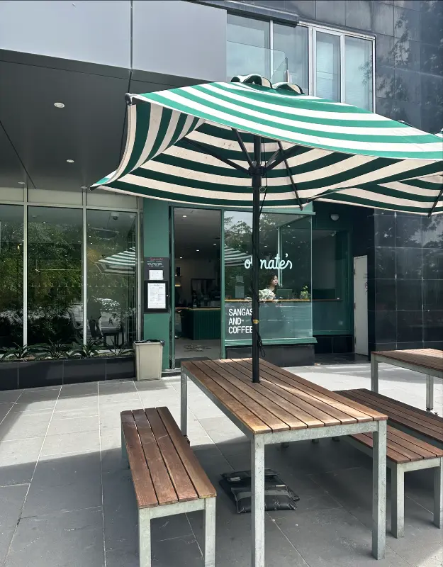 카페 외부 모습. 초록색 스트라이프 파라솔이 인상적이다.