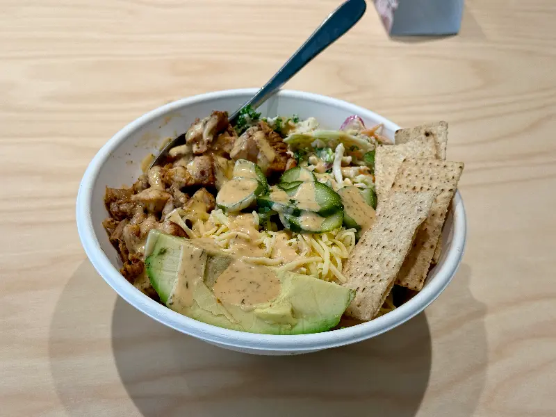 드디어 기다리던 블랙큰드 치킨 버거 볼이 나왔다. 따뜻한 블랙큰드 치킨과 신선한 야채, 고소한 드레싱이 한데 어우러진 모습이 식욕을 자극했다. 마치 해체된 버거를 먹는 듯한 느낌이었지만, 바삭한 콘칩 덕분에 식감이 더욱 풍성하게 느껴졌다. 드레싱도 넉넉하게 뿌려져 있어 촉촉하게 즐길 수 있었다.