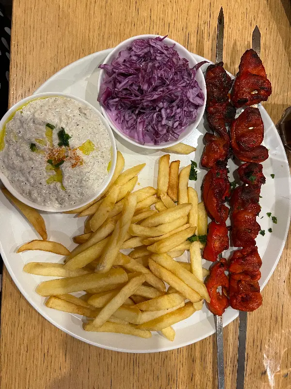 탄두리 치킨 꼬치, 가지 딥, 적양배추 샐러드, 감자튀김의 환상적인 조합!