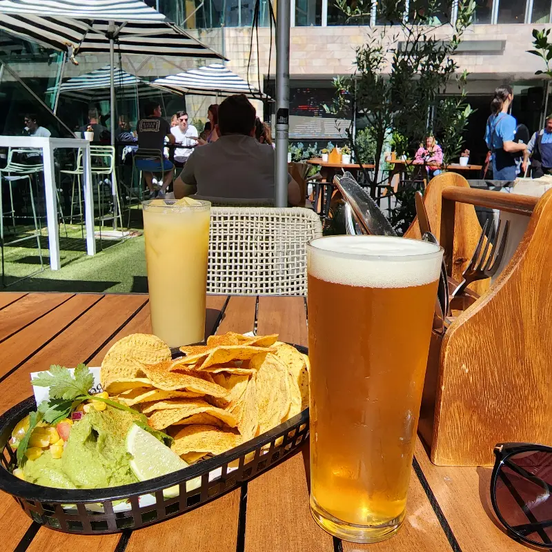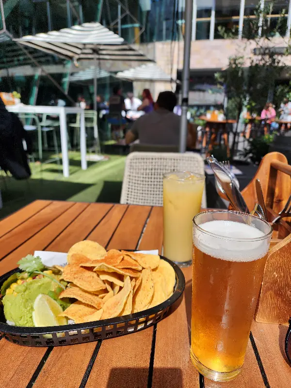야외 테라스의 낭만, 맥주와 과카몰리 나초의 완벽한 조화