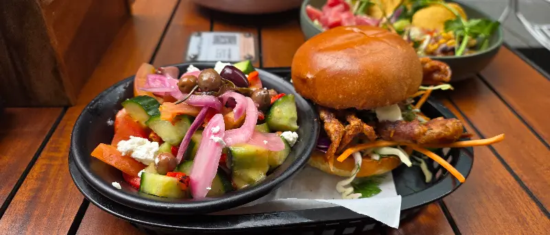 Sammi님은 소프트쉘 크랩 버거에서 감자튀김을 빼고 그릭 샐러드를 추가하는 특별한 요청을 했습니다. 직원은 흔쾌히 요청을 받아들였고, 덕분에 Sammi님은 더욱 만족스러운 식사를 즐길 수 있었습니다. 갓 튀겨진 소프트쉘 크랩은 눅눅함 없이 바삭하고 신선했으며, 펍 스타일 메뉴에 질린 사람들에게 Beer Deluxe는 훌륭한 대안이 될 수 있습니다.