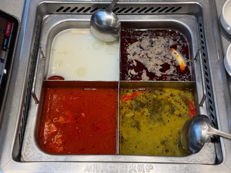 하이디라오의 가장 큰 매력 중 하나는 바로 다양한 탕을 선택할 수 있다는 점이다. 개인의 취향에 따라 탕을 고를 수 있다는 점이 훠궈 입문자들에게는 큰 장점으로 다가온다. 우리는 각자 좋아하는 맛을 고려하여 4가지 탕을 주문했다. 얼큰한 마라탕, 깊고 진한 버섯탕, 신선한 토마토탕, 그리고 부드러운 후추탕.