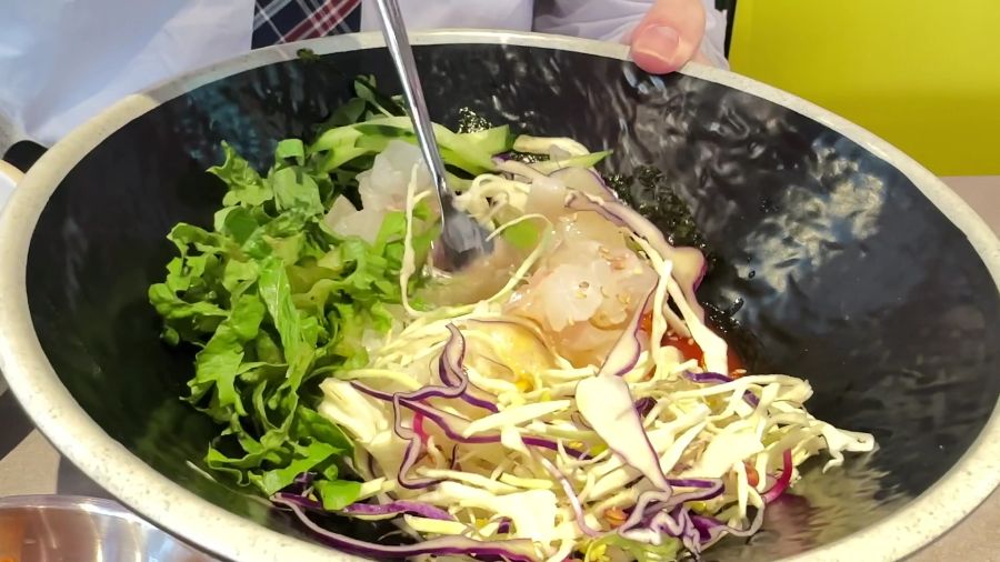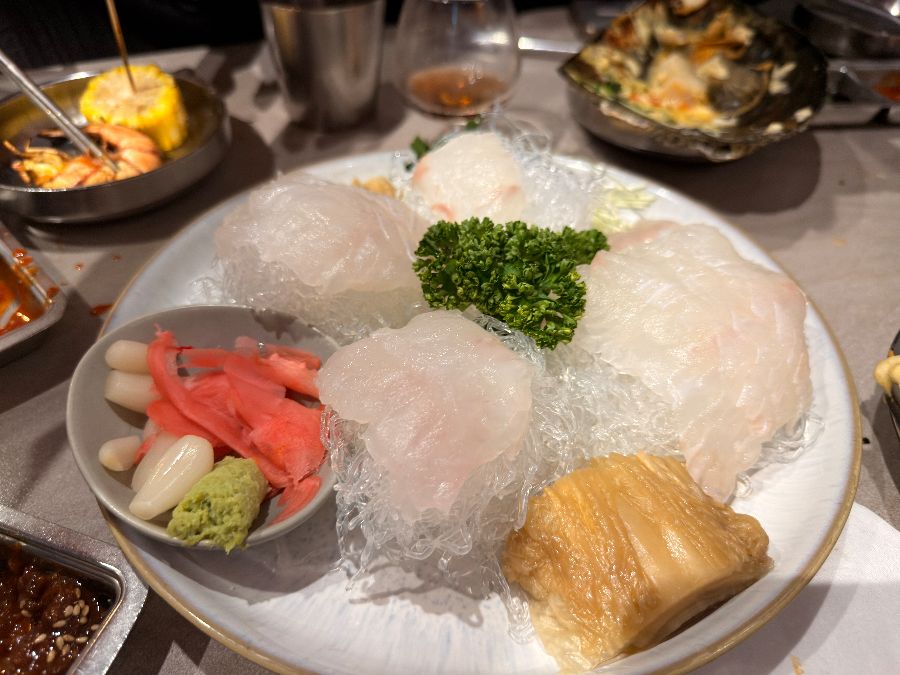 육즙 가득한 해산물 회와 시원한 조개탕의 조화