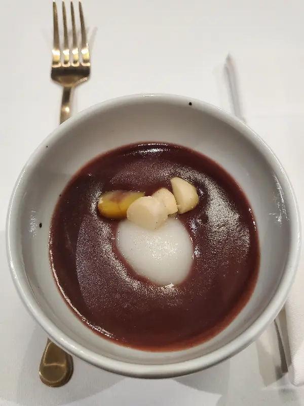자리에 앉자마자 따뜻한 단팥죽이 나왔습니다. 팥의 은은한 단맛과 함께 옹심이처럼 쫀득한 식감이 느껴졌습니다. 첫 입에 느껴지는 따스함은 긴장을 풀어주고 편안한 식사를 기대하게 만들었습니다. 마치 부드러운 담요를 덮은 듯 포근한 시작이었습니다. 사진에서 보이는 것처럼, 팥죽은 정갈한 백색 그릇에 담겨 나왔는데, 소담하게 올려진 고명이 시각적인 즐거움까지 더했습니다.
