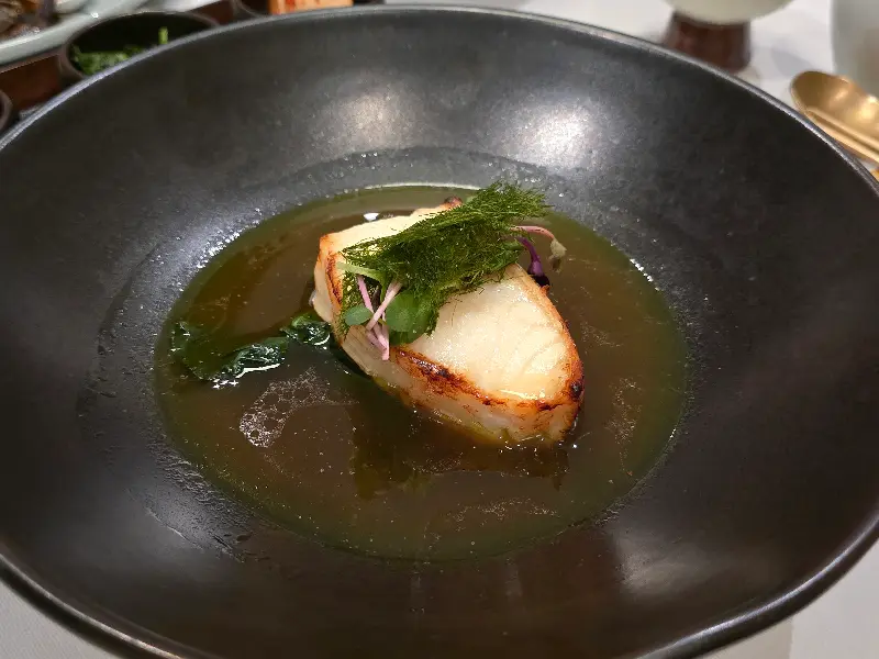 디너 코스의 하이라이트라고 할 수 있는 은대구 구이는 정말 잊을 수 없는 맛이었습니다. 겉은 바삭하고 속은 촉촉한 은대구는 입안에서 부드럽게 녹아내렸습니다. 특히 함께 나온 시금치와 장을 곁들여 먹으니 느끼함은 사라지고, 은대구의 풍미가 더욱 깊게 느껴졌습니다. 간이 세지 않아 어르신들의 입맛에도 잘 맞을 것 같았습니다. 콩두의 은대구 구이는 단순한 생선 요리가 아닌, 미각을 자극하는 하나의 ‘경험’이었습니다.